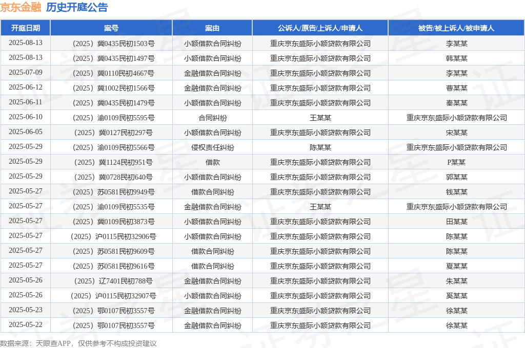 本站消息,根据天眼查APP显示,近日公布了一则重庆京东盛际小额贷款有限公司作为原告/上诉人的开庭公告,详细内容如下: